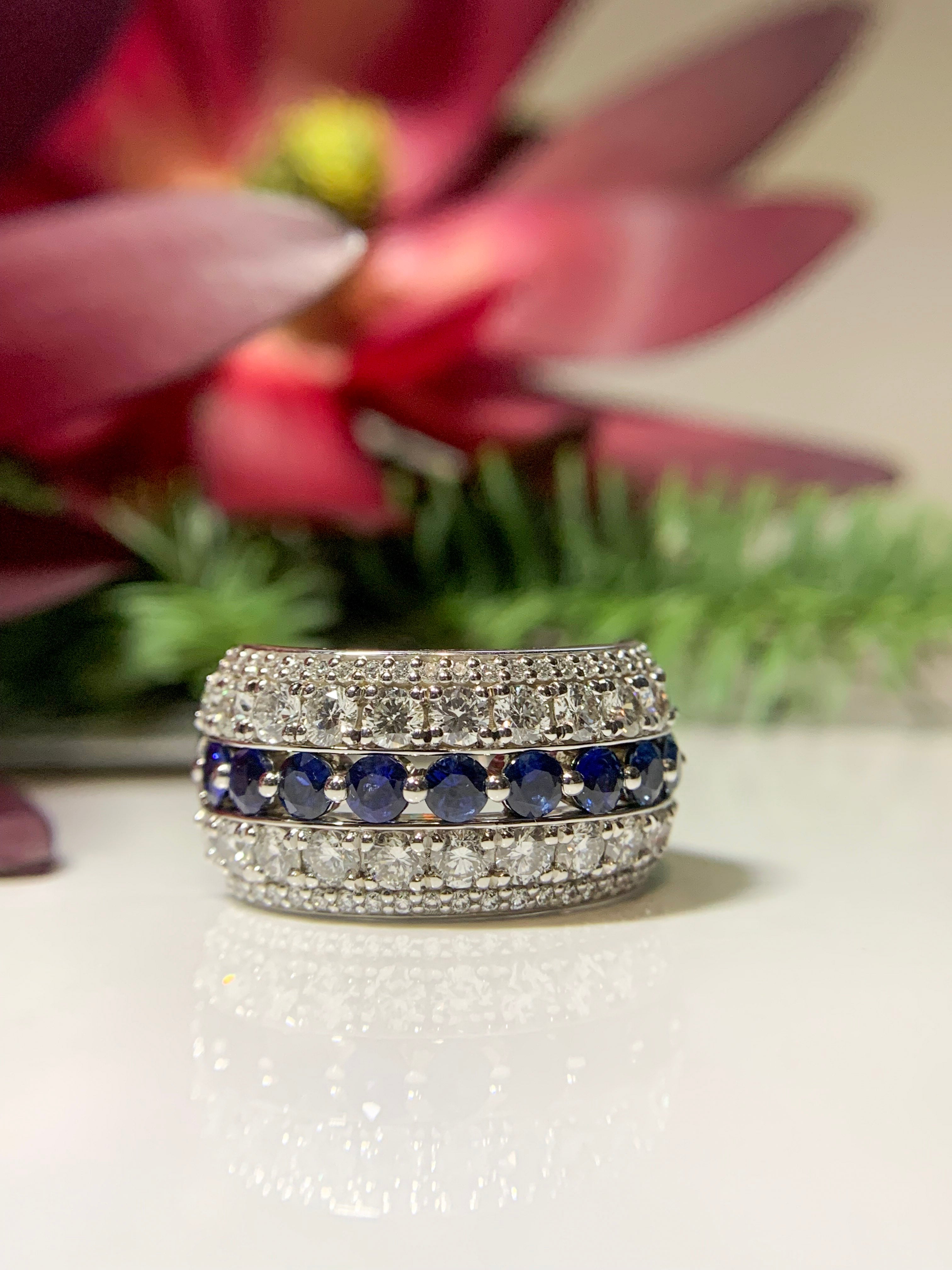 So we removed all the stones and created a similar look to the old setting with everything set in one smooth, low profile, and comfortable ring. With a tapered back it still allows for a WOW look on top yet more mobility between the fingers. We changed the new setting so that all the larger stones were the focal point and the smaller ones accented the border.
