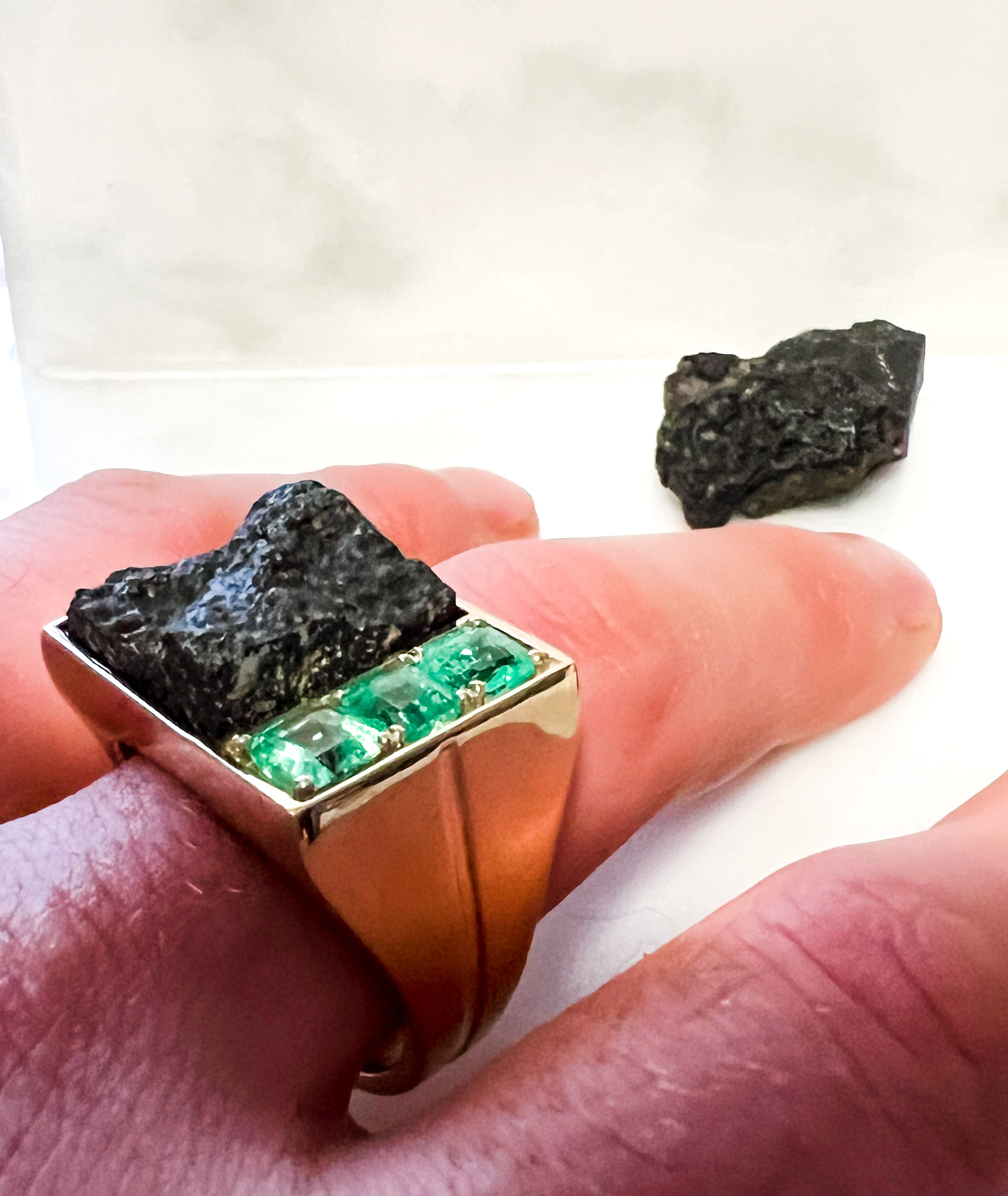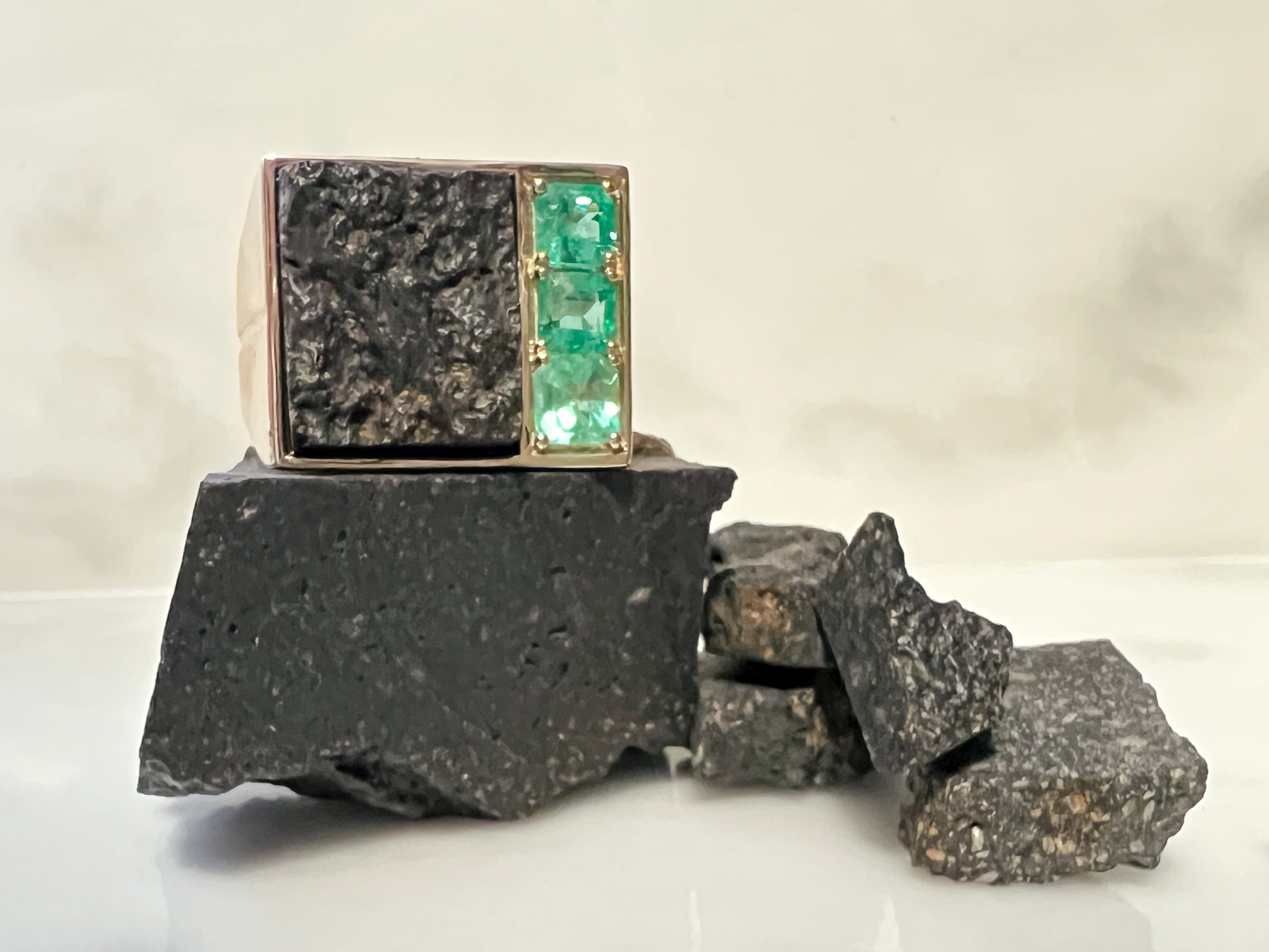 Some travels deserve more than a photograph. But rather a token, a creation worn everyday as a reminder just how beautiful this world is. The black lava rock is from the Chimborazo Volcano in Ecuador while the three emeralds are from a mine in Bogotá Columbia. Two completely different parts of the world with one thing in common; both being on the equator line. Which brought this design to light. A men’s signet ring fashioned with an engraved line symbolizing the equator travelling from one destination to the next.