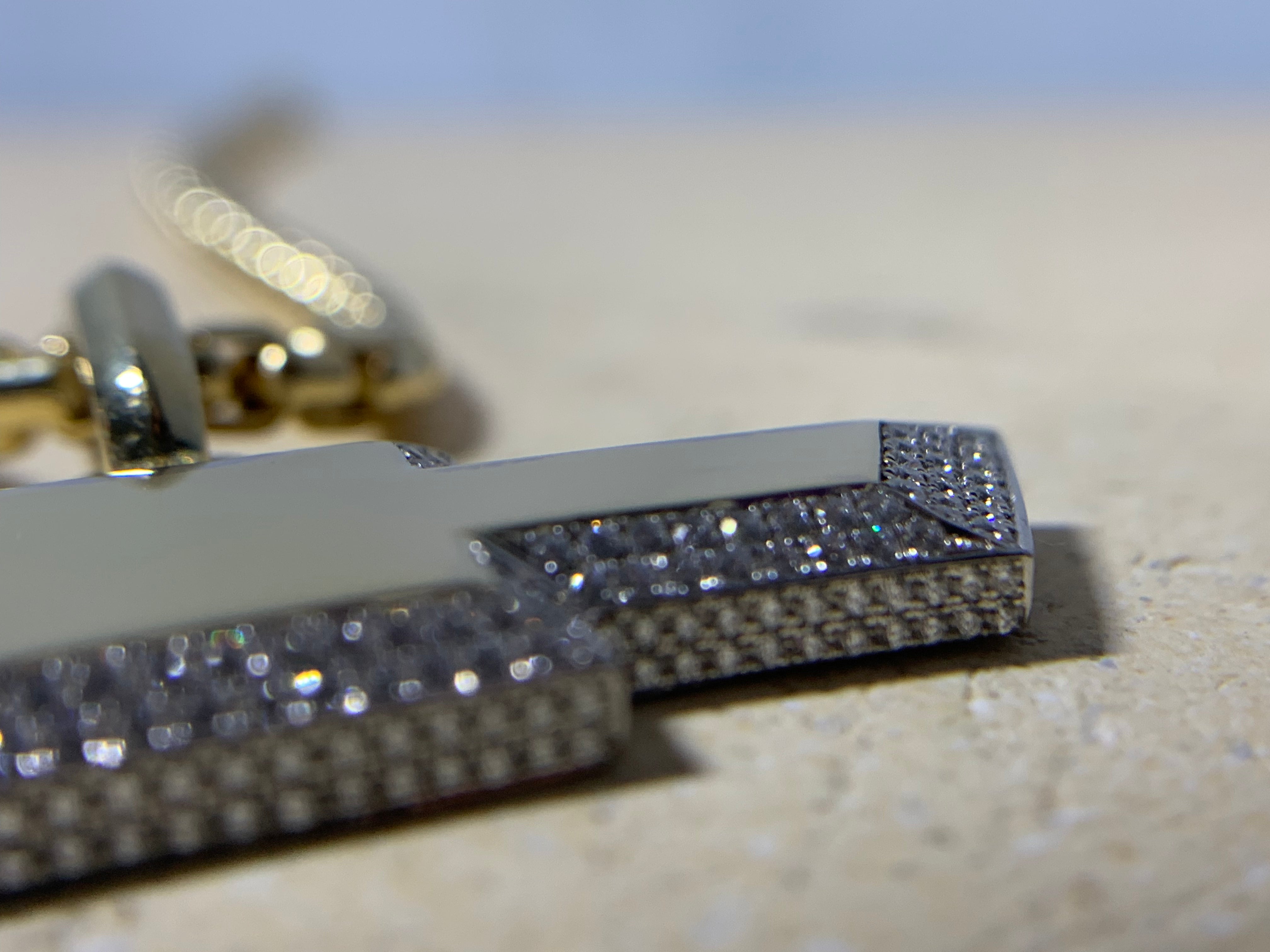Solid 18kt two tone Chevrolet pendant with pavé diamond trim.