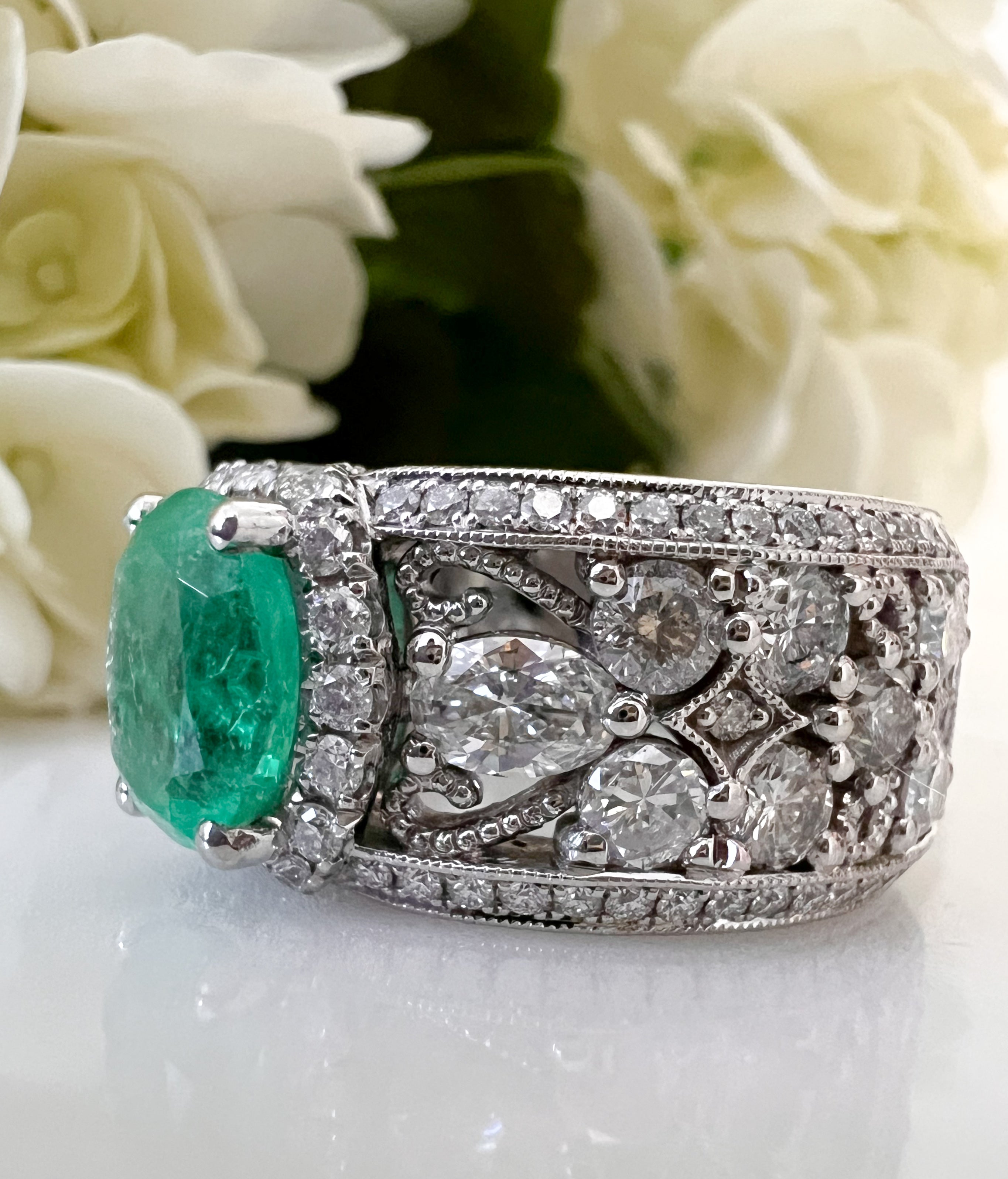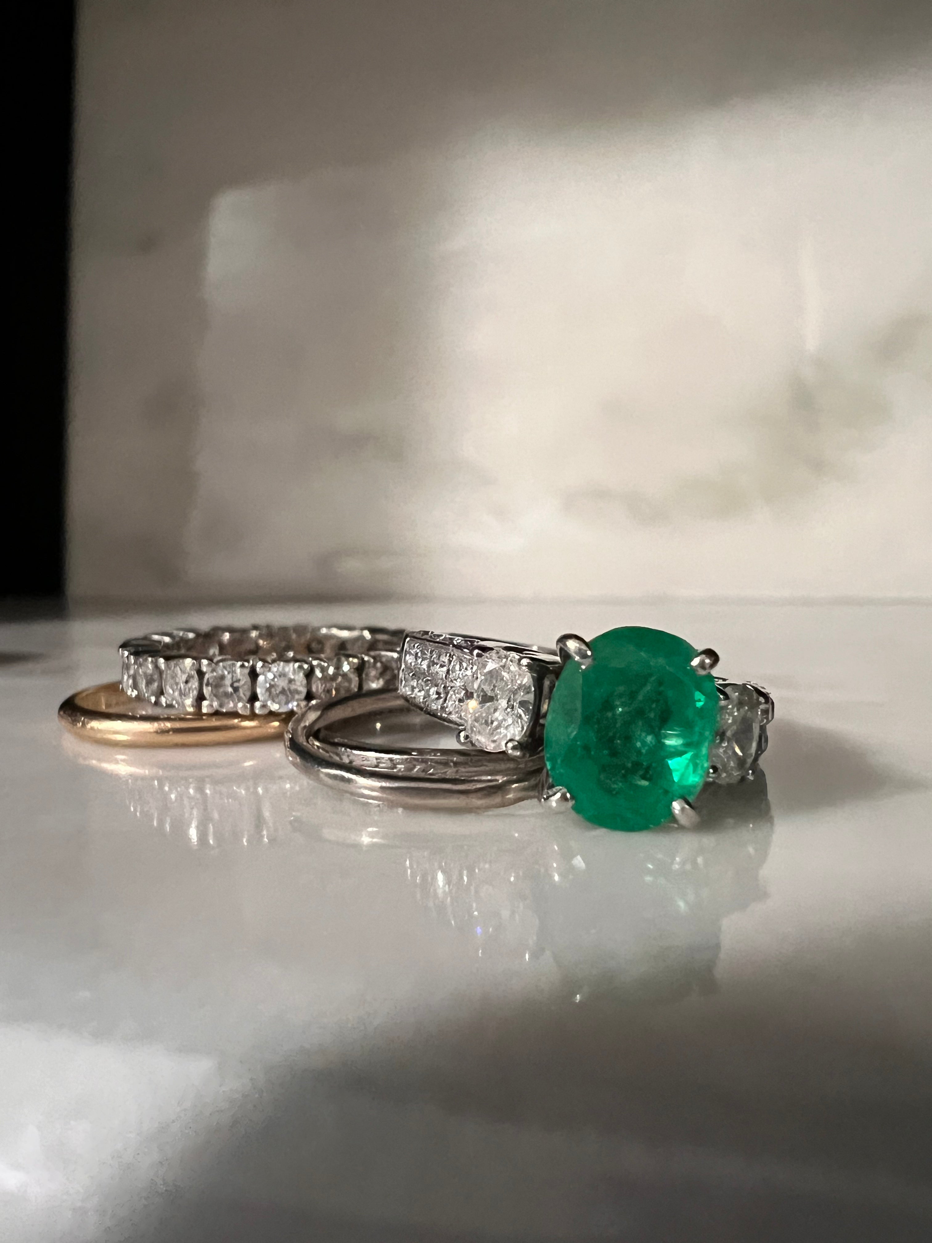 I had the joy of redesigning a magnificent ring for a client, infusing her treasured diamonds and emerald into a fresh, captivating design. This collaborative journey was a delight, seamlessly merging her sentimental gems with a contemporary flair, resulting in a one-of-a-kind creation that beautifully mirrors her individuality.