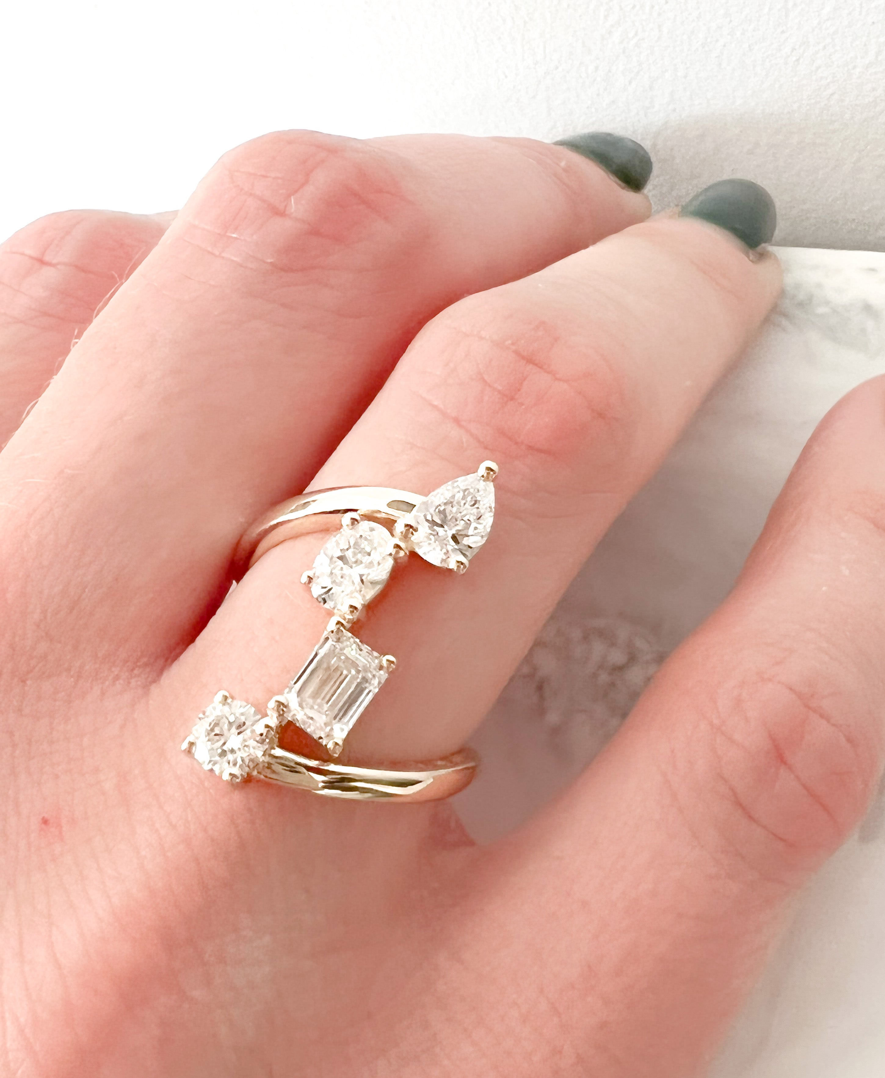 Let’s take a moment to celebrate life. This gorgeous diamond ring was designed to signify just that. Four diamonds marks celebrating turning 40, 4 generations of females in the family and of course her 4 beautiful children. Each different shape representing each child, and intended to be passed down to them. Four diamonds held together by a free flowing gold band.
